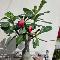 Adenium, also known as Desert Rose, is a striking tropical plant admired for its thick, sculptural trunk, glossy green leaves, and vibrant trumpet-shaped flowers in shades of red, pink, and white. Native to arid regions, it thrives in bright sunlight and well-draining soil, making it an excellent choice for sunny balconies or indoor spots with ample light. Its unique form and drought tolerance make it both a decorative and low-maintenance plant for modern homes