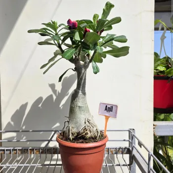 Adenium, also known as Desert Rose, is a striking tropical plant admired for its thick, sculptural trunk, glossy green leaves, and vibrant trumpet-shaped flowers in shades of red, pink, and white. Native to arid regions, it thrives in bright sunlight and well-draining soil, making it an excellent choice for sunny balconies or indoor spots with ample light. Its unique form and drought tolerance make it both a decorative and low-maintenance plant for modern homes.