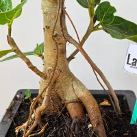 Lakshya is a banyan bonsai with a straight, rising trunk and young surface roots starting to show at the base. Its foliage sits higher up, leaving the structure open and easy to observe. A good choice for someone who enjoys watching a bonsai slowly fill out and develop over time.