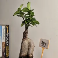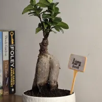 The Aaru Ficus is a Ficus Ginseng bonsai featuring a thick, bulbous trunk and a compact green canopy.and its roots store water, making it a low-maintenance choice for homes or offices. and It has a sturdy, natural look and comes in a simple, round white Plastic pot with a textured finish.and It is a reliable, decorative plant that fits easily on any tabletop or desk.