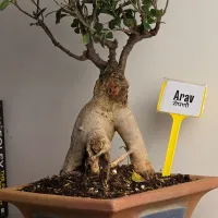 Arav is a Ficus Ginseng bonsai defined by his flared trunk that stands firmly in a wide, traditional ceramic pot. His thick, pale roots branch out like the legs of a mountain, providing a massive foundation for his remarkably wide and expansive canopy.