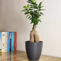 Ficus Ginseng Bonsai is a popular indoor bonsai tree known for its thick, pot-bellied trunk and glossy green leaves. It’s easy to care for, thrives in bright indirect light, and tolerates occasional neglect, making it ideal for home or office decor