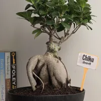 Chiku is a Ficus Ginseng bonsai distinguished by its broad, multi-limbed bulbous trunk and a lush, dense canopy of small, waxy dark green leaves. and he plant features a unique sculptural form with textured bark and visible aerial roots that provide a sense of maturity and stability. It is presented in a modern charcoal-colored bowl-shaped Plastic pot with a matching base, offering a clean and professional look for home or office decor.