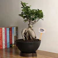 Ficus Ginseng Bonsai is a type of bonsai tree from the Ficus microcarpa species, known for its thick, gnarled roots resembling ginseng and its dense, glossy green foliage.