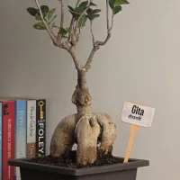 Gita is a Ficus Ginseng bonsai featuring a distinctive, multi-legged bulbous trunk and an upright, branched canopy. and The plant displays a mature sculptural form with a sturdy trunk that provides a sense of natural stability. It is presented in a modern, rectangular deep-charcoal nursery pot with a clean rim, offering a minimalist and grounded finish that is well-suited for any home or office tabletop.