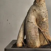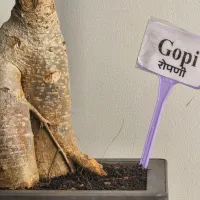 Gopi is a Ficus Ginseng bonsai distinguished by its exceptionally thick, tapered aerial roots that form a solid, tripod-like base with a strong sense of balance. and its features a wide, spreading canopy of glossy dark green leaves, offering a lush crown that contrasts beautifully with its substantial, light-colored textured bark. and It is presented in a classic, deep charcoal square bonsai Plastic pot, providing a sophisticated and stable aesthetic that fits perfectly on a desk or modern bookshelf.