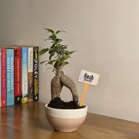 Kesh is a Ficus Ginseng bonsai featuring a distinctive, multi-legged bulbous trunk and an upright, branched canopy. and The plant displays a mature sculptural form with a sturdy trunk that provides a sense of natural stability. It is presented in a modern, dual-toned ceramic pot with a smooth cream upper and a soft, earthy-toned base, offering a contemporary and grounded finish that is well-suited for any home or office tabletop.
