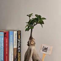 Lavi is a Ficus Ginseng bonsai featuring a distinctive, multi-legged bulbous trunk and an upright, branched canopy. and The plant displays a mature sculptural form with a sturdy trunk that provides a sense of natural stability. It is presented in a sleek, round black Plastic pot with a fine textured finish, offering a modern and grounded look that is well-suited for any home or office tabletop.