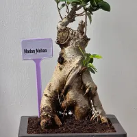 Madan Mohan is a ficus bonsai with a broad, mature trunk that narrows gently as it rises, showing natural scars and texture from years of growth. The canopy sits higher, giving it a calm, upright presence, while the dark square pot keeps the focus firmly on the tree itself. It works well on a study table, sideboard, or shelf where its form can be seen clearly without visual clutter.