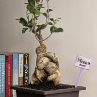 Meenu is a Ficus Ginseng bonsai featuring a distinctive, multi-legged bulbous trunk and an upright, branched canopy. and The plant displays a mature sculptural form with a sturdy trunk that provides a sense of natural stability. It is presented in a modern, rectangular deep-charcoal nursery pot with a clean rim, offering a minimalist and grounded finish that is well-suited for any home or office tabletop.