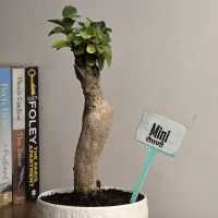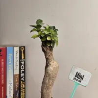 Mini is a Ficus Ginseng bonsai featuring a distinctive, elegant bulbous trunk and a compact, upright canopy.and This indoor evergreen stores moisture within its thick, textured root system, making it a reliable and low-maintenance choice for indoor environments. The plant displays a sculptural form with a slender, tapering trunk that provides a sense of natural stability. It is presented in a clean, round white Plastic pot with a fine textured finish, offering a bright and grounded look that is well-suited for any home or office tabletop.