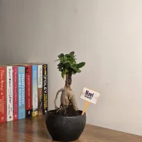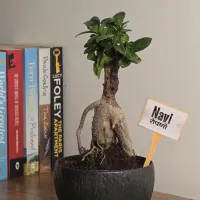Navi is a Ficus Ginseng bonsai featuring a distinctive, multi-legged bulbous trunk and an upright, branched canopy. and The plant displays a sculptural form with a sturdy trunk that provides a sense of natural stability. It is presented in a sleek, round black Plastic pot with a fine textured finish, offering a modern and grounded look that is well-suited for any home or office tabletop.