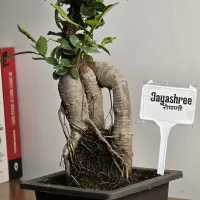 Jayashree is a bonsai that showcases a complex and fascinating triple-trunk structure, where several thick, muscular stems merge at the base. Its most striking feature is the web of delicate aerial roots that cling to the trunk, giving it the appearance of an ancient forest giant in miniature. Topped with a lush crown of vibrant green leaves, this bonsai exudes a sense of abundance and victory, living up to its name.