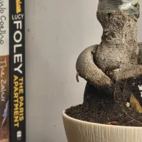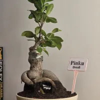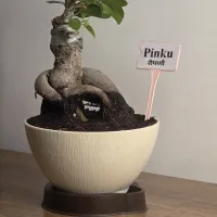 Pinku is a Ficus Ginseng bonsai distinguished by its uniquely wide, sprawling aerial roots that create a low-profile, stable base with an organic, sculptural flow. and its features a graceful, vertical crown of glossy dark green leaves, offering a lush canopy that contrasts beautifully with its sturdy, light-colored bark. and It is presented in a modern, textured cream-colored bowl-shaped Plastic pot, providing a clean and sophisticated aesthetic that complements a minimalist home or office setting.