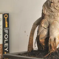 Rekha is a Ficus Ginseng bonsai distinguished by its uniquely bulbous, multi-limbed aerial roots that create a sturdy and anthropomorphic base. and its features an canopy of glossy dark green leaves, offering a lush contrast to its thick, beautifully textured light-colored bark. and It is presented in a classic, deep charcoal square bonsai Plastic pot, providing a sophisticated and grounded aesthetic that perfectly complements a modern home or office bookshelf.