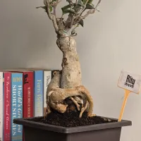 Ritu is a Ficus Ginseng bonsai distinguished by its tall, slender trunk and an intricate, exposed aerial root system at the base. and It is presented in a deep-charcoal, square matte pot, offering a clean and modern aesthetic that complements the plant's mature, sculptural form.