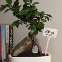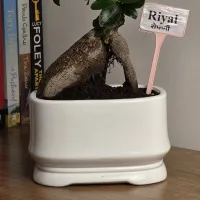 Riyal is a Ficus Ginseng bonsai distinguished by its prominent, thick bulbous trunk and a compact canopy of dark green, waxy leaves. and It is presented in a clean, white rectangular ceramic pot, offering a bright and modern finish that is well-suited for home or office tabletops.