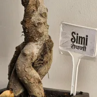 Simi is a Ficus Ginseng bonsai that captivates with her tall, spiraling trunk and intricate texture. Unlike traditional styles, her roots are tightly interwoven, creating a beautiful vertical flow and lush canopy.