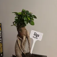 Siya is a Ficus Ginseng bonsai define by her curvaceous trunk that splits into a wide, powerful base, acting as a natural pedestal for her lush foliage and Topped with a dense, emerald canopy.