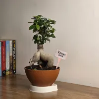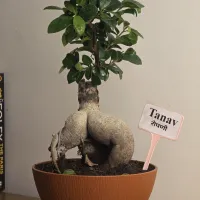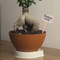 Tanav is a Ficus Ginseng bonsai distinguished by its thick, muscular aerial roots that form a grounded and powerful base. it features a neat, rounded crown of glossy dark green leaves, providing a lush canopy that contrasts beautifully with its smooth, light-colored bark. and It is presented in a warm, terracotta-toned bowl-shaped Plastic pot with a clean white base, offering a modern and sophisticated aesthetic for a minimalist home or office.