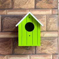 This Green Wooden Bird House features a bright lime green body with classic vertical plank detailing and a contrasting white gabled roof. This bird house is designed with a perfectly sized circular entrance that provides a secure nesting spot for small garden species like sparrows, finches, and chickadees. and For secure installation, the house is equipped with two pre-drilled mounting holes—one above and one below the entrance—allowing it to be fixed firmly onto garden walls, balcony pillars, or wooden fences. Made from solid wood with bird-safe, non-toxic paint, it offers a durable and weather-resistant shelter that brings a fresh, natural look to any outdoor space.
