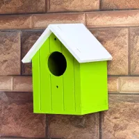 This Green Wooden Bird House features a bright lime green body with classic vertical paneling and a contrasting white gabled roof. Designed with a perfectly sized circular entrance, it provides a secure and cozy nesting spot for small garden birds like sparrows and finches. The sloping roof is built to shed rainwater effectively, keeping the interior dry and protected.