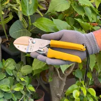 The J.S.P. Roll-Cut Secateur is a pruning tool engineered for high-precision gardening and long-lasting durability. Featuring a specialized roll-cut mechanism, it delivers clean, effortless cuts with a single-stroke action that minimizes hand strain while working on fruit trees, flowers, and court wood. With a reliable 12mm cutting capacity, it is ideal for maintaining plant health by providing sharp, accurate trims that promote faster healing of the shoots. This "Make in India" product is equipped with ergonomic, high-visibility yellow handles for a comfortable grip and easy identification in the garden.
