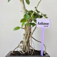 Aadhavan is a young banyan bonsai with a tall, upright trunk and clearly visible aerial roots beginning to form near the base. Its growth is more vertical than wide, with fresh green leaves spaced along the stem, giving it a clean, open structure. This one is ideal for someone who enjoys watching a bonsai slowly develop character over time, especially the thickening of roots and canopy as it matures.