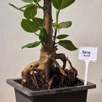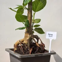 Karna is a Banyan bonsai defined by its remarkably thick, muscular trunk and a dramatic network of exposed aerial roots. Unlike more delicate styles, its rugged base gives it the presence of a timeless forest giant, topped with a dense canopy of lush green leaves. It is a sculptural masterpiece that commands attention in any collection.