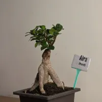 Aira is a Ficus Ginseng bonsai defined by her perfectly balanced, tripod-like root base and Her thick, textured trunk rises with a steady strength, transitioning into a delicate, branching crown. Topped with a vibrant canopy of emerald-green leaves.