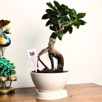 फाइकस जिनसेंग बोनसाई एक यूनिक और अर्टेक्टिव बोनसाई किस्म है जो अपनी मोटी, उभरी हुई जड़ों के लिए जानी जाती है जो जिनसेंग जैसी होती हैं, इसकी पत्त्यिॉ ओवलशेप और चमकदार होती है। यह फाइकस की माइक्रोकार्पा वेरायटी से भी संबंधित है और अपनी मजबूत प्रकृति के कारण सभी बनोसाई प्रेमियों के बीच लोकप्रिय है। यह इनडायरेक्ट सनलाइट में अच्छे से ग्रो करता है। इसे अच्छे भाग्य के साथ साथ, संपन्नता और सद्भाव का प्रतीक भी माना जाता है, इसे इनडोर सजावट और एक अच्छे ग्रीन गिफ्ट के रूप में भी उपयोग किया जाता है। नियमित छंटाई इसके कॉम्पैक्ट और आर्टिस्टिक शेप को बनाए रखने में मदद करती है।