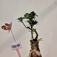 Chirojit features a thick banyan-style trunk with a compact root base and a gentle upward curve. The foliage is concentrated at the top, giving it a clean, vertical form. Planted in a square pot, it’s ideal for desks or shelves and suited for someone who enjoys watching a bonsai slowly develop its structure.