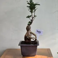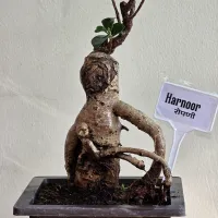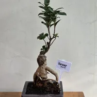 Harnoor' is a Ficus Ginseng bonsai characterized by its tall, slender silhouette and a highly textured, bulbous trunk. Its most fascinating feature is the human-like posture of its base, with a thick root extending outward like a resting arm.
