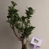Nina is a Ficus Ginseng bonsai defined by her curvaceous, sculptural trunk that splits into a bold, tripod-like root base. This heavy, textured foundation creates a striking contrast against her slender, branching canopy.