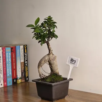Ficus microcarpa, शुरुआती लोगों के लिए एक बेहतरीन बोनसाई है। यह अपनी नाटकीय और उभरी हुई जड़ों के लिए जाना जाता है जो पानी जमा करती हैं और इसे सूखे के प्रति अत्यधिक सहनशील बनाती हैं। इस मजबूत पौधे में चमकदार सदाबहार पत्तियों का एक घना समूह होता है और इसकी शाखाओं से जंगल जैसी हवाई जड़ें (aerial roots) निकलने की अनूठी क्षमता होती है। यह घर के अंदर उज्ज्वल और अप्रत्यक्ष प्रकाश (indirect light) व उच्च नमी में बहुत अच्छी तरह पनपता है, जो इसे किसी भी स्थान के लिए एक कम रखरखाव वाला विकल्प बनाता है। हालांकि जगह बदलने पर इसके पत्ते गिर सकते हैं, लेकिन यह बहुत तेज़ी से बढ़ता है और छंटाई व आकार देने पर बहुत सुंदर रूप ले लेता है। अंततः, यह एक कठोर और जीवंत मूर्ति की तरह है जो आपके घर में शांति (Zen) और कालातीत सुंदरता का एहसास लाता है।