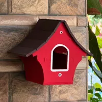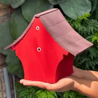 The Red Scalloped Wooden Bird House features a unique wide-body design with decorative side panels and a contrasting deep brown, shingle-style roof. This bird house stands out with its bold red finish and a wide, white-framed arched entrance that allows easy access for small garden birds like sparrows and finches. and For secure installation, the house is equipped with a triple-point mounting system using three pre-drilled holes, making it easy to fix firmly onto garden walls, balcony pillars, or wooden fences. Made from solid wood with bird-safe, non-toxic paint, it provides a durable and weather-resistant shelter that adds a cheerful touch to any outdoor space.