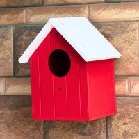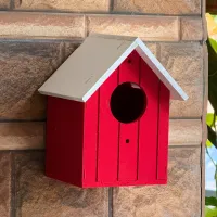 This Red Wooden Bird House serves as a vibrant and secure sanctuary for small garden birds such as sparrows and finches. It features a bold red body with classic vertical paneling and a contrasting white gabled roof designed to shed rainwater effectively. Equipped with a perfectly sized circular entrance and two pre-drilled mounting holes, this sturdy house allows for quick and secure installation on balcony walls, garden fences, or pillars. Its clean, functional design adds a cheerful pop of color to any outdoor space while providing a weather-resistant haven for birds to rest or nest throughout the year.