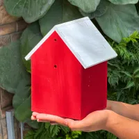 This Red Wooden Bird House offers a vibrant and secure nesting spot for small garden birds like sparrows and finches. It features a bold red body with classic vertical paneling and a contrasting white gabled roof designed to shed water effectively. With a perfectly sized circular entrance and two pre-drilled mounting holes for quick installation, this sturdy house is ideal for mounting on balcony walls, garden fences, or pillars etc.
