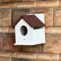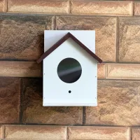 The White Wooden Bird House features a clean, white body paired with a contrasting dark brown gabled roof. This house is designed with a perfectly sized circular entrance that provides a safe and cozy nesting spot for small garden birds like sparrows and finches. and For secure installation, the house includes an extended back panel and a pre-drilled mounting hole on the front, allowing it to be fixed firmly onto garden walls, balcony pillars, or wooden fences. Made from solid wood with bird-safe, non-toxic paint, it offers a durable and weather-resistant shelter that brings a timeless, natural look to any outdoor space.