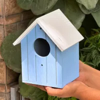 This compact wooden bird house is designed as a simple and safe nesting space for small birds like sparrows and finches. It features a sturdy light blue body with vertical paneling and a contrasting white gabled roof that helps shed rainwater. The front is equipped with a circular entrance hole and two pre-drilled mounting holes, making it easy to secure directly onto garden walls, balcony pillars, or fences. Its clean, functional design is ideal for home gardens or urban balconies where space is limited, providing a sheltered spot for birds to rest or nest throughout the year.